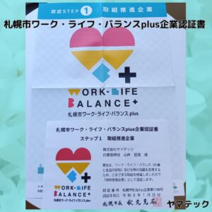 このたび、当社は札幌市より「ワーク・ライフ・バランスplus企業」として認証され、認証書が届きました。